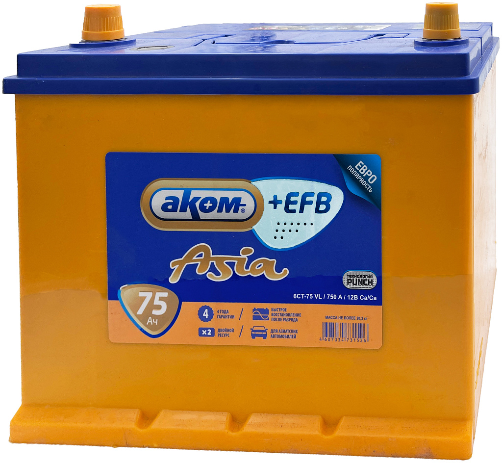 АКБ AKOM Asia +EFB — это современная кальциевая батарея с жидким электролитом, созданная по технологии EFB на заводе «Аком» (г. Жигулёвск). Аккумулятор разработан с учётом требований автомобилей азиатского типа и сочетает надёжность с высокой пусковой мощностью
