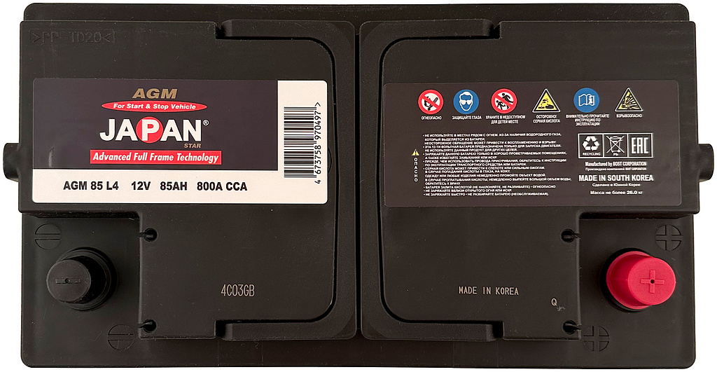 Автомобильный аккумулятор JAPAN STAR AGM производится южнокорейским заводом BOST CORPORATION, известным своими инновационными технологиями и высоким качеством продукции. Эта серия разработана специально для современных автомобилей, оснащённых системой Start-Stop и большим количеством электронных систем.