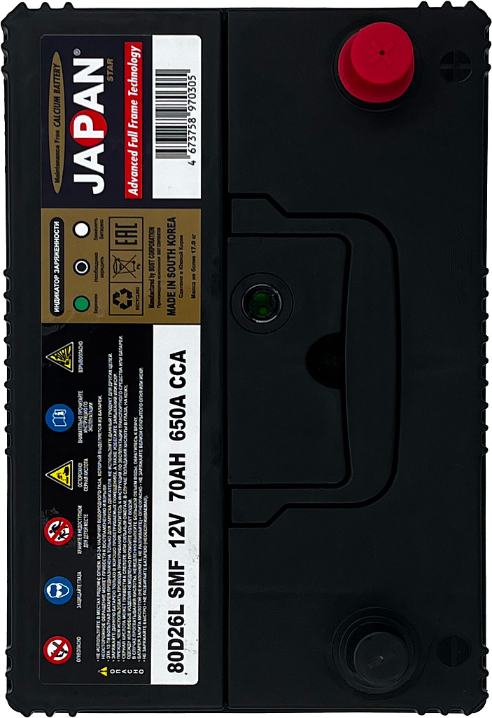 АКБ JAPAN STAR SMF — прочный и надёжный аккумулятор, который обеспечивает уверенный запуск двигателя и стабильную работу всех электрических систем автомобиля на протяжении многих лет.