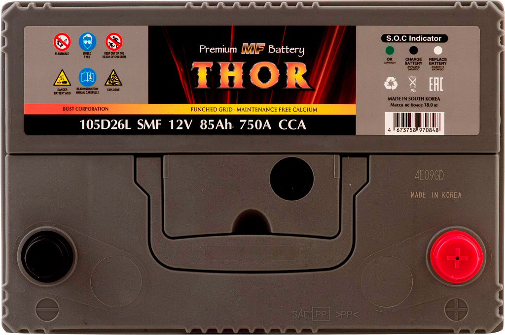 Автомобильный аккумулятор THOR SMF — серия аккумуляторов премиум-класса, выпускаемая заводом BOST CORPORATION (Южная Корея). Производитель применяет запатентованные технологии и материалы высокого качества, обеспечивая стабильную работу и продолжительный срок службы батарей.
