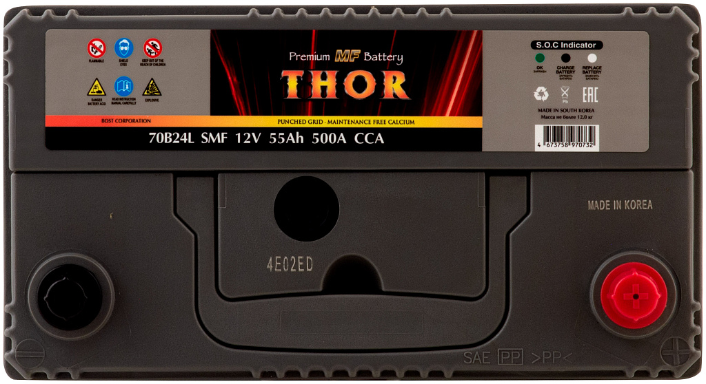 Автомобильный аккумулятор THOR SMF — серия аккумуляторов премиум-класса, выпускаемая заводом BOST CORPORATION (Южная Корея). Производитель применяет запатентованные технологии и материалы высокого качества, обеспечивая стабильную работу и продолжительный срок службы батарей.