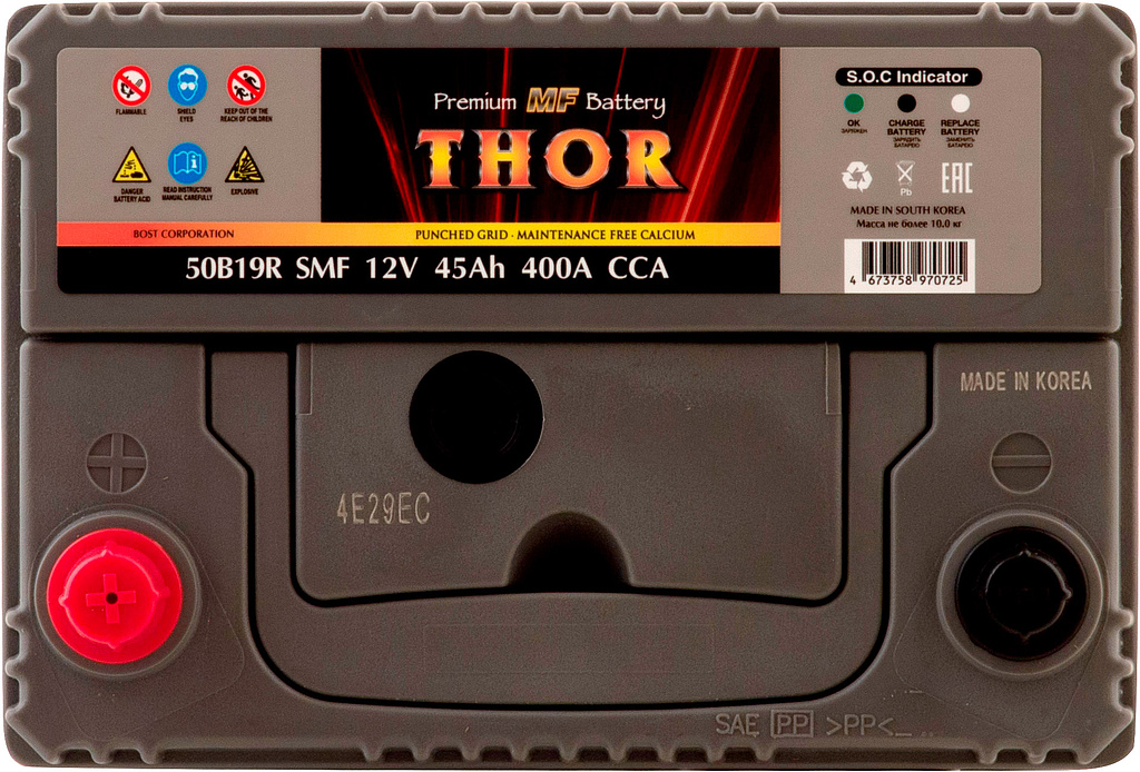 Автомобильный аккумулятор THOR SMF — серия аккумуляторов премиум-класса, выпускаемая заводом BOST CORPORATION (Южная Корея). Производитель применяет запатентованные технологии и материалы высокого качества, обеспечивая стабильную работу и продолжительный срок службы батарей.