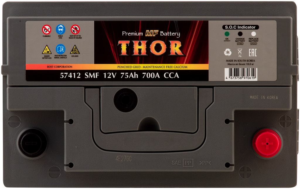 Автомобильный аккумулятор THOR SMF — серия аккумуляторов премиум-класса, выпускаемая заводом BOST CORPORATION (Южная Корея). Производитель применяет запатентованные технологии и материалы высокого качества, обеспечивая стабильную работу и продолжительный срок службы батарей.