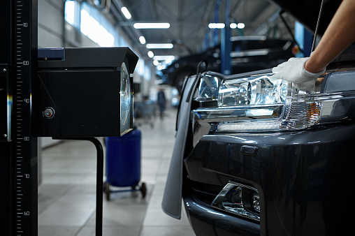 Проверка пучка света при помощи стенда, корректировка пучка света.
